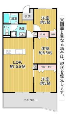 | 間取り(内訳) | 3LDK(洋室5.5/洋室5/洋室5/LDK15.5) | ||